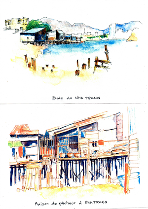 Denis et Dominique Maindive, amis de longue date d’Henri, ont effectué deux voyages au Vietnam : le premier en 2014, le deuxième en 2016. Un voyage commun en Asie du Sud-Est avait été programmé par Henri et Denis quelques années auparavant, mais Henri est finalement parti seul. Dans leur jeunesse, les deux amis avaient en revanche voyagé ensemble dans le grand nord. Les dessins et aquarelles de Denis peuvent être perçus comme un écho souriant au regard ironique d’Henri. « Essayer de restituer les couleurs, les scènes de vie... Plus de 6000 kms parcourus, beaucoup d’images et beaucoup de rencontres... « Nous sommes sous le charme de ce pays. » écrivent Denis et Dominique Maindive, en 2016. Suivons-les dans leur amitié pour un Vietnam qui a retrouvé le bonheur de la paix...